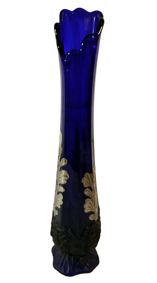 Striking Vintage 1960s-70s Cobalt Blue Vase with Silver Leaf Embellishment