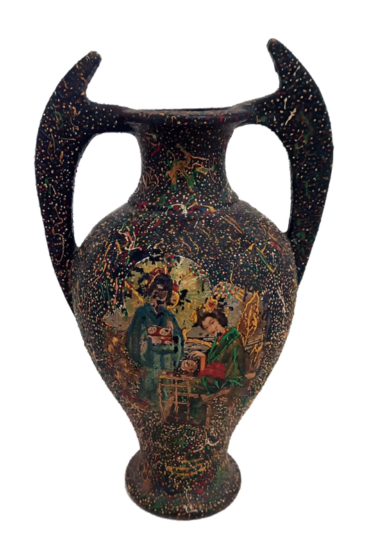Hand-Painted Clay Amphora, Asian Motif - Mid 20th Century